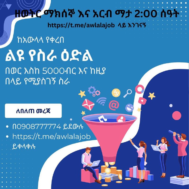 2 years ago🔥🔥ልዩ የስራ ዕድል!🔥🔥 👌👌ማንኛውም ሰውመደበኛ ስራውን እየሰራ ሊሰራው የሚችል! 🚀🚀በወር እስከ 5000ብር እና ከዚያ በላይ የሚያስገኝ ስራ 🙌100% እውነተኛ ! ለሰሩት ስራ ወዲያውኑ ክፍያዎትን ይረከባሉ! ማየት ማመን ነው፣ ይህን https://t.me/awlalajob የቴሌግራም ግሩፕ አሁኑኑ ተቀላቅለው ስለስራው የሚሰጠውን መግለጫ ይከታተሉ። ዘወትር ማክሰኞ እና አርብ ማታ 2:00 ሰዓትላይ https://t.me/awlalajob ቴሌግራም ቻናል ላይ ስለስራው የሚሰጠውን መግለጫ ይከታተሉ። ለማንኛውም ጥያቄ በ ☎️☎️0908777774☎️☎️ ይደዉሉ ለበለጠ መረጃ እነኚህን ቴሌግራም ግሩፖች ይቀላቀሉ https://t.me/awlalajob https://t.me/awlalagebeya https://t.me/awlalaaffiliates