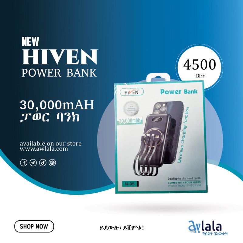 2 years ago🔋30000 mAH of capacity 📺Status display ⚡️Charges 3 times faster 4️⃣Comes with four wires iPhone, micro, type C & USB 💰4499birr only 🚚free delivery 📞call us 0908777774