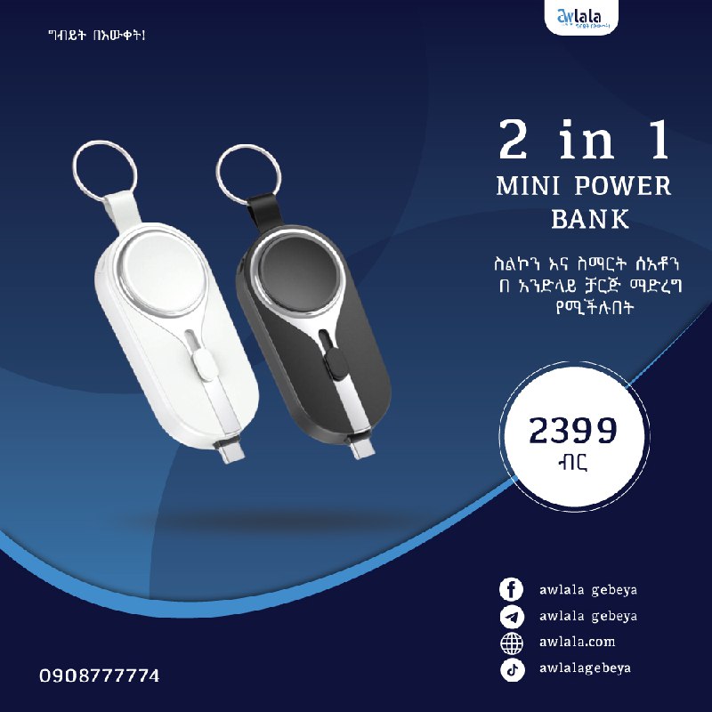 2 years ago✅ለብርቱ ጉዳይ በፈለጉት ጊዜ ድንገት ስልክዎ ባትሪ ቢዘጋስ? ✅ከቁልፍ መያዣዎ ላይ የሚያንጠለጥሏት እቺ ፓወር ባንክ መፍትሄ አላት:: ✅ከስልክዎ በተጨማሪ ለስማርት ዎች ዋየርለስ ቻርጂንግ አማራጭ አለው:: ለአጠቃቀም እና ይዞ ለመንቀሳቀስ እጅግ ምቹ እና ቀላል ✅እስከ 2000mah አቅም አለው እጅግ በተመጣጣኝ ዋጋ ይደውሉልን:: 📞0908777774 💸2399 br