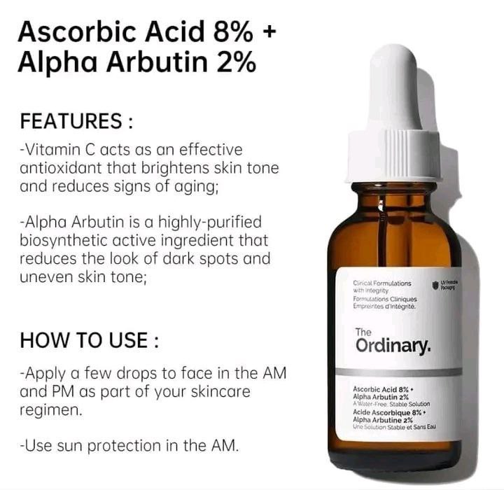 1 year ago🟣 The Ordinary Ascorbic Acid 8%+ Alpha Arbutin 2% 🟣 🔹 Blend of active vitamin C and alpha-arbutin 🔹 To notably brighten skin tone and lighten spots. 🔹 Reverses spot formation & uneven pigmentation 🔹 Fights signs of aging 🔹 Creates spotless, glowing skin tone 🔹 Ascorbic Acid 8% Alpha Arbutin 2% 🔹 Perfect for brightening skin 🔹 Minimizing the appearance of an even akin tone 🔹 Reduces the look of dark spots 🔸 የብጉር ጠባሳን ለማጥፋት 🔸 የተለያየ የፊት ከለርን ለማመሳሰል 🔸 ለማፍካት 100 % original product 100% ኦሪጅናል ምርት Contact us using our number ☎️ 0924030393 ☎️ 0976635872 🛻 Delivery allover Addis Ababa & out side Addis Ababa 🛻 በመላው አዲስ አበባ እና ከአዲስ አበባ ውጪ 🛻 ወደ ክፍለሀገር እንልካለን 📍አድራሻ 1 ሰሚት ሳፋሪ ዲቦኔርስ ፒዛ ፊትለፊት አደይ ሽሮ አጠገብ በሚገኘው ህንፃ ውስጥ ግራውድ ላይ ያገኙናል።